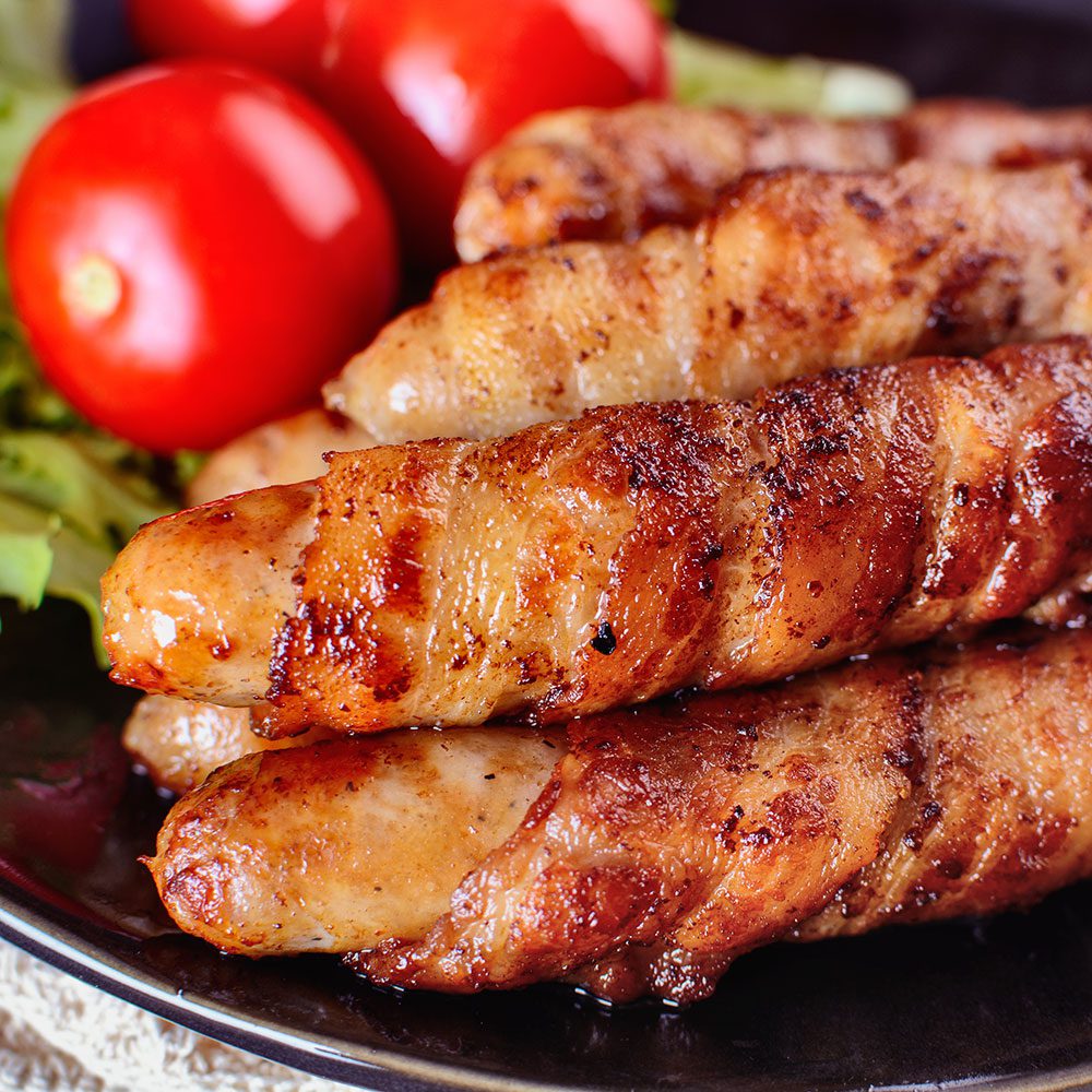 3,8 kg. grisekød (8-10% fedt) hakkes igennem 3 mm hulskiven eller minihakker til den ønskede grovhed er opnået. 3,8 kg. spæk hakkes igennem 3 mm hulskiven eller minihakker til den ønskede grovhed er opnået og stilles derefter i kølerum. Grisekødet kommes op i røremaskinen og køres nogle omgange, hvorefter 100 gram nitritsalt og 350 gram Baconpølse uden mel og mælk tilsættes sammen med 1,9 kg. isvand. Når dette er rørt fint ud tilsættes det hakkede spæk og 500 gram isvand. Røres til en god emulsion er opnået. 2,5 kg. bacon i tern iblandes og hakkes/røres ned til 3-5 mm. Sluttemperatur 12-14°C.