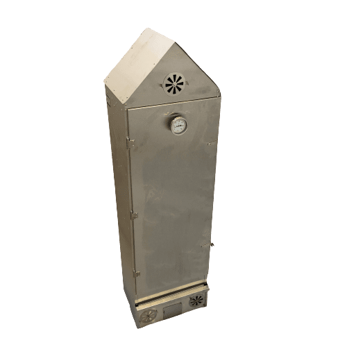 Firkantet røgeovn med sadeltag til kold- og varmrøgning. h x b x d: 140 cm x 39 cm x 28 cm.